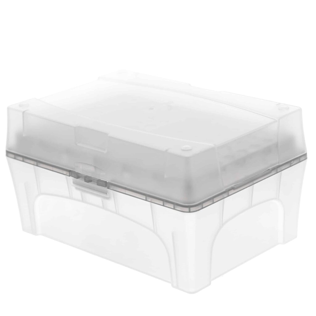 - Możliwość układania w stosy: pudełka można przechowywać w stosach oszczędzając miejsce. Każda pojemność pasuje tak samo (50 ul, 200 ul, 1000 ul)