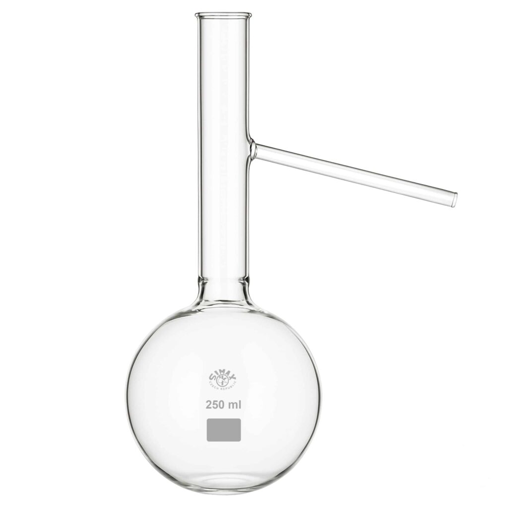 Model wyposażony w ramię dolne umieszczone w 1/3 wysokości szyjki. Kolba destylacyjna SIMAX posiada jednakową grubość ścianek, co zapewnia równomierne nagrzewanie. Materiał wykazuje odporność na działanie gorącej wody, kwasów i roztworów zasadowych.