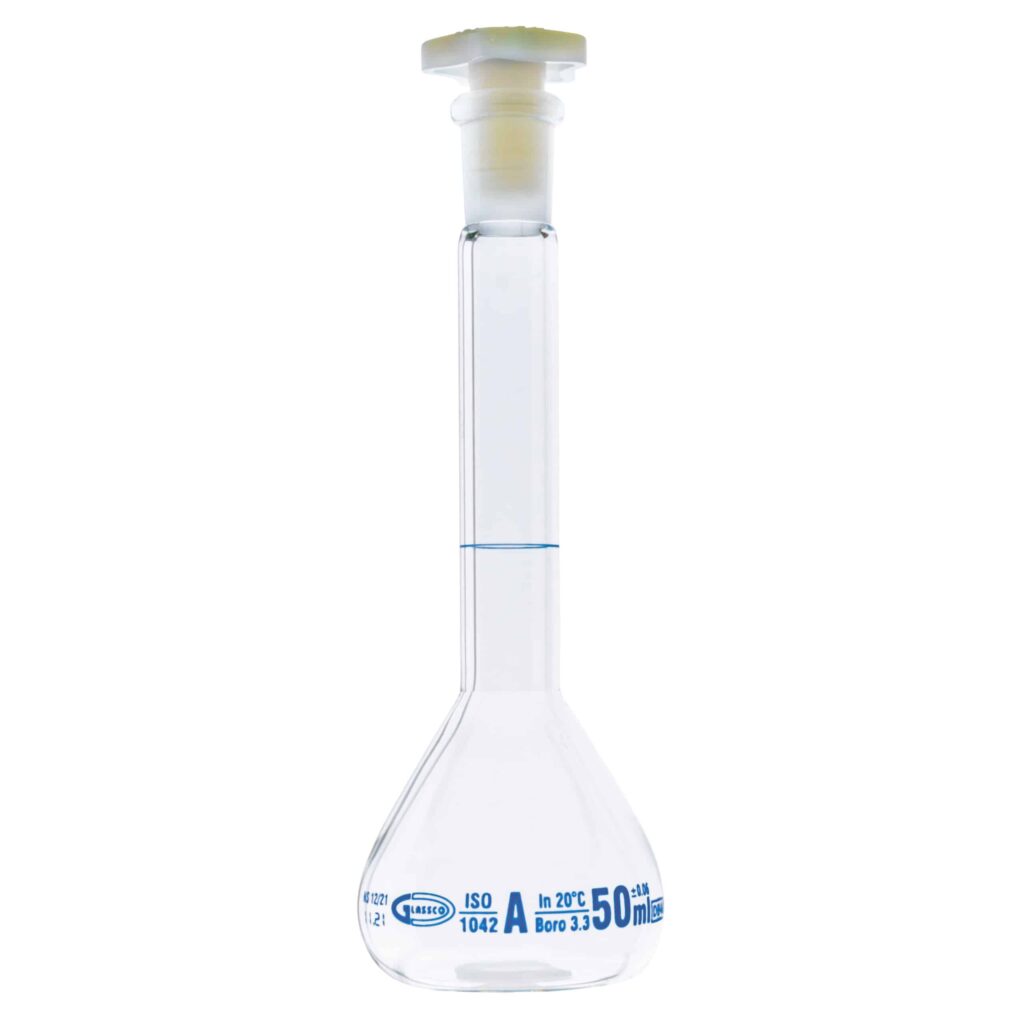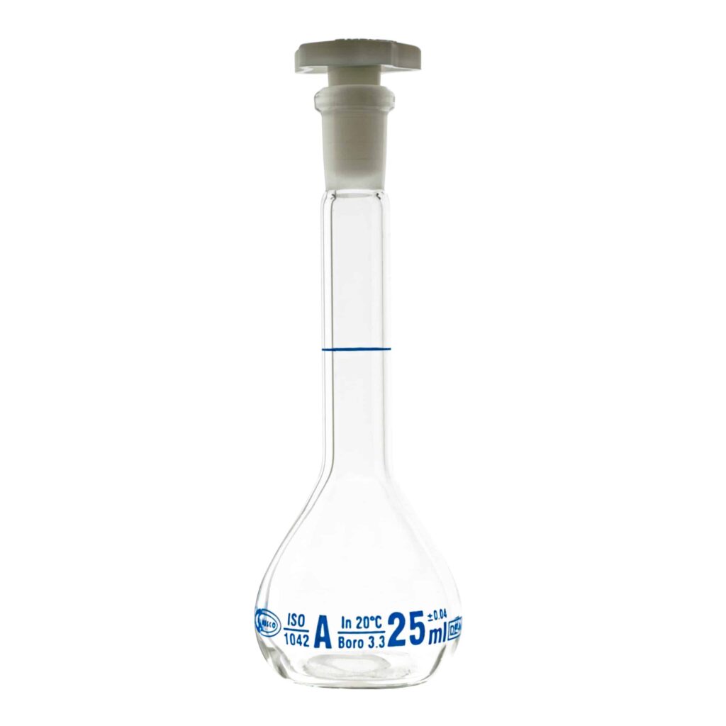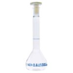 Kolba miarowa ze szkła borokrzemowego 3.3 z korkiem wykonanym z polietylenu (PE). Dostępne różne rozmiary.
