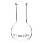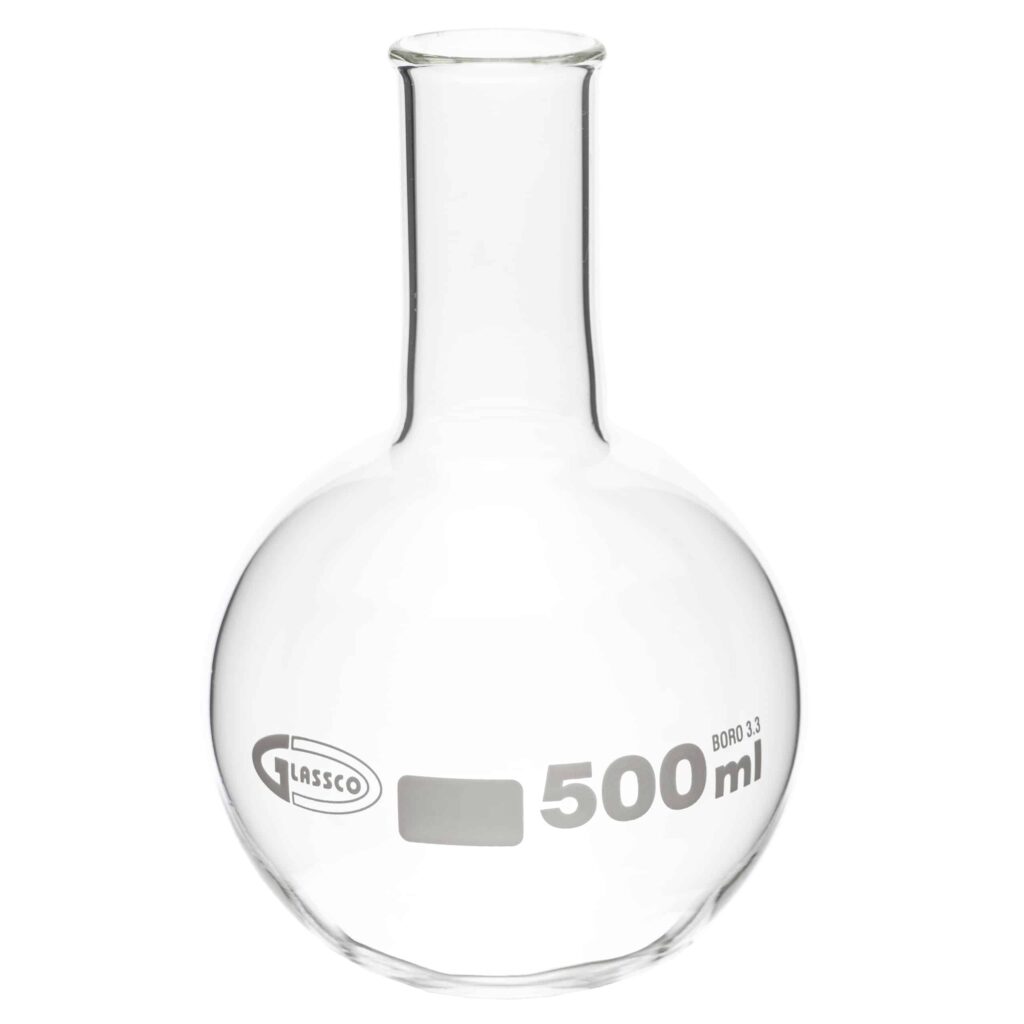 Kolba płaskodenna z szyją bez szlifu wykonana ze szkła borokrzemowego 3.3 firmy Glassco. Dostępna w wielu rozmiarach.