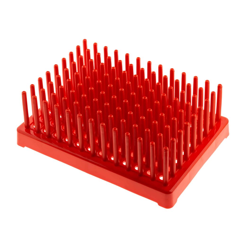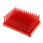 Czerwony stojak na probówki typu jeż wykonany z wytrzymałego polipropylenu (PP).
