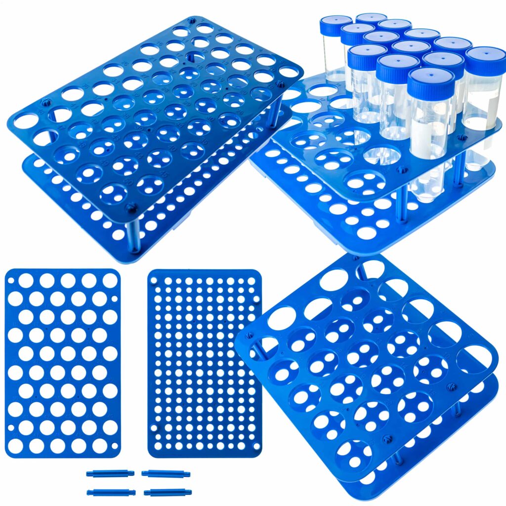 Plastikowy stojak na probówki typu Falcon. Składany. Dostępny w kilku wariantach i rozmiarach.