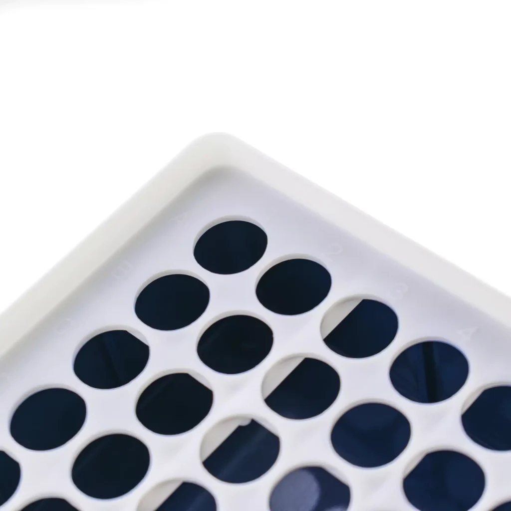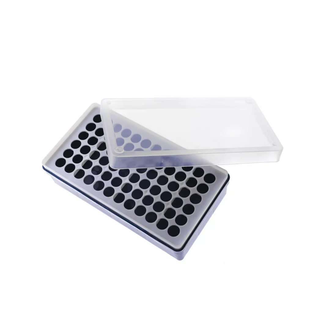 Pudełko typu tip-box z wbudowanym statywem na probówki, wykonane z trwałego polipropylenu (PP). Wyposażone w zamykane wieczko, które chroni zawartość przed zanieczyszczeniami i umożliwia bezpieczne przechowywanie probówek. Konstrukcja zapewnia stabilne ułożenie probówek i wygodę użytkowania.