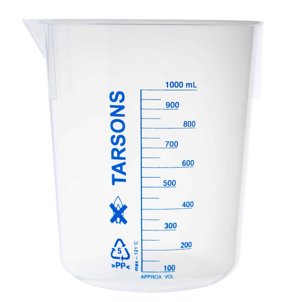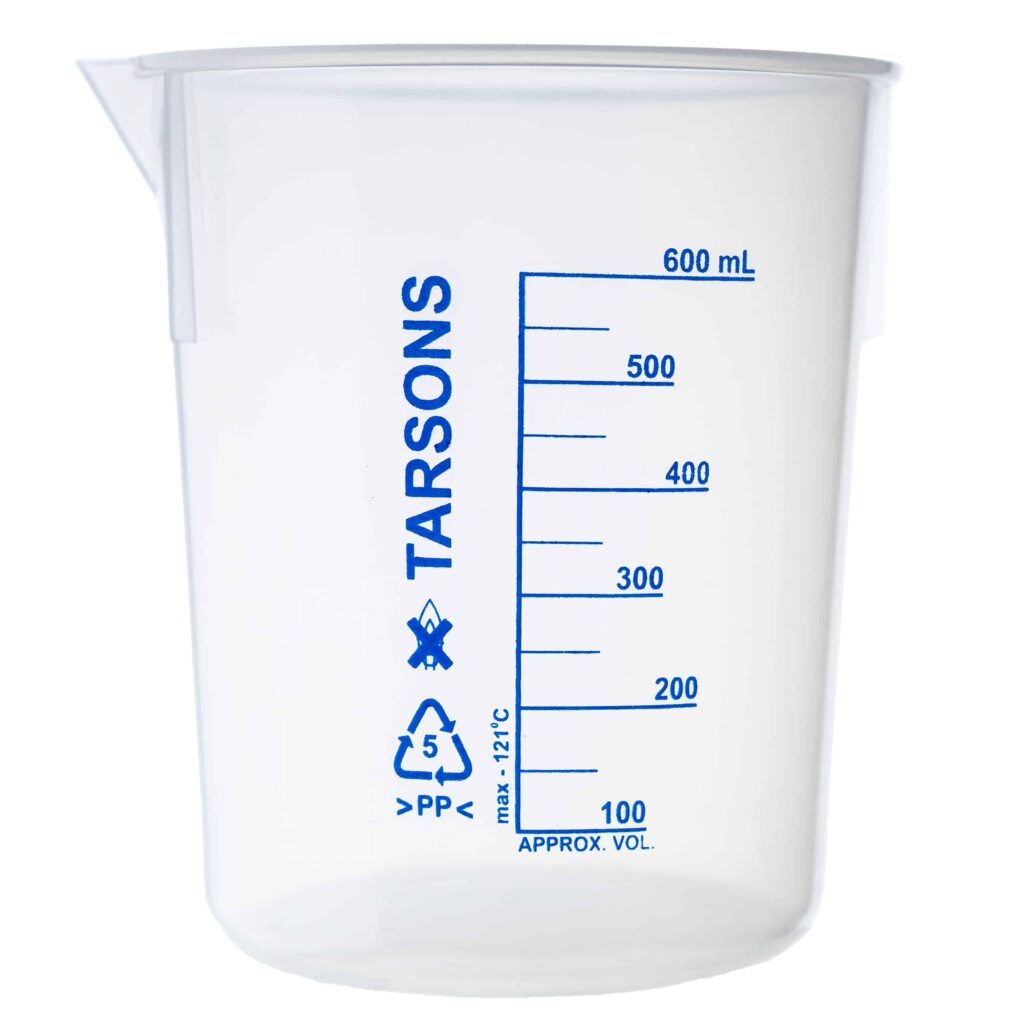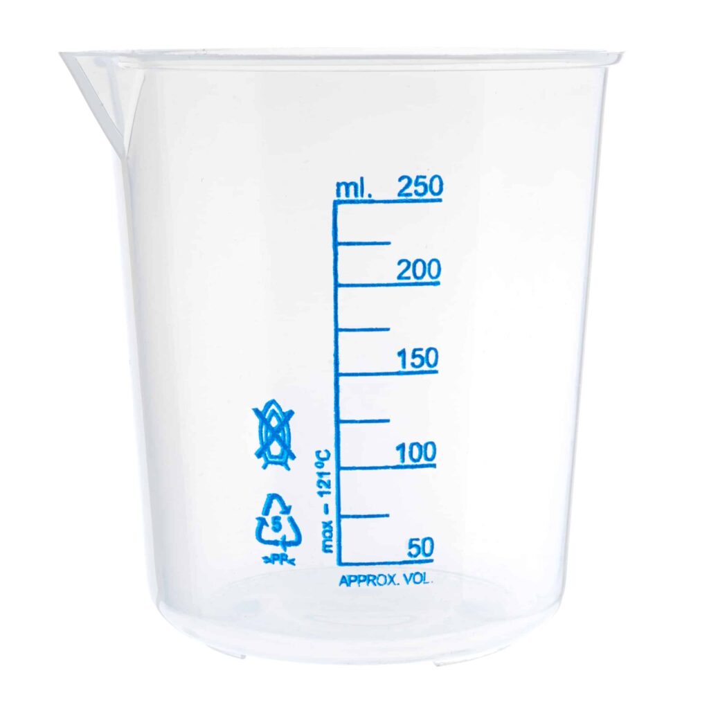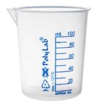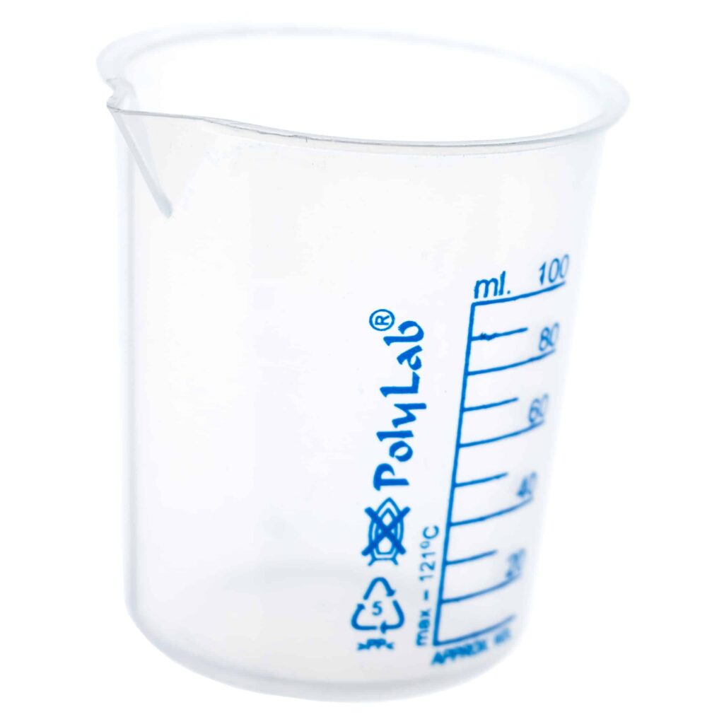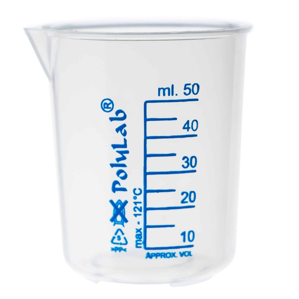 Zlewka laboratoryjna z wylewem, skala malowana niebieska. Wykonana z polipropylenu PP, dobra odporność chemiczna.